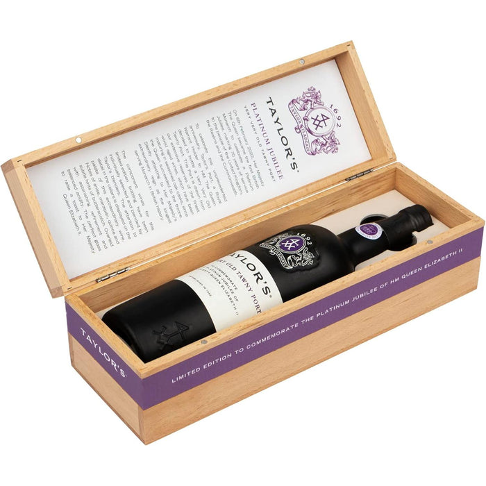 This exceptional Taylors Tawny Port Platinum Jubilee Limited Edition is drawn from extensive reserves of the finest wood aged wines, which have been maturing in seasoned oak casks, since the Queen succeeded to the throne, silently attesting to Her Majesty’s extraordinary reign as the longest serving Monarch in British history.