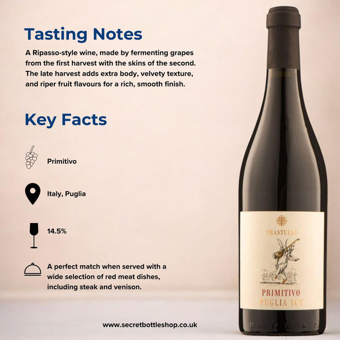 Crafted in Puglia from organically grown Primitivo grapes, this red wine uses a ripasso-style method. Grapes are harvested in two stages: the first batch is fermented, then re-fermented with the pomace from the second harvest to add body and texture. The wine is aged in barrel for 3–6 months to soften tannins and enhance complexity.